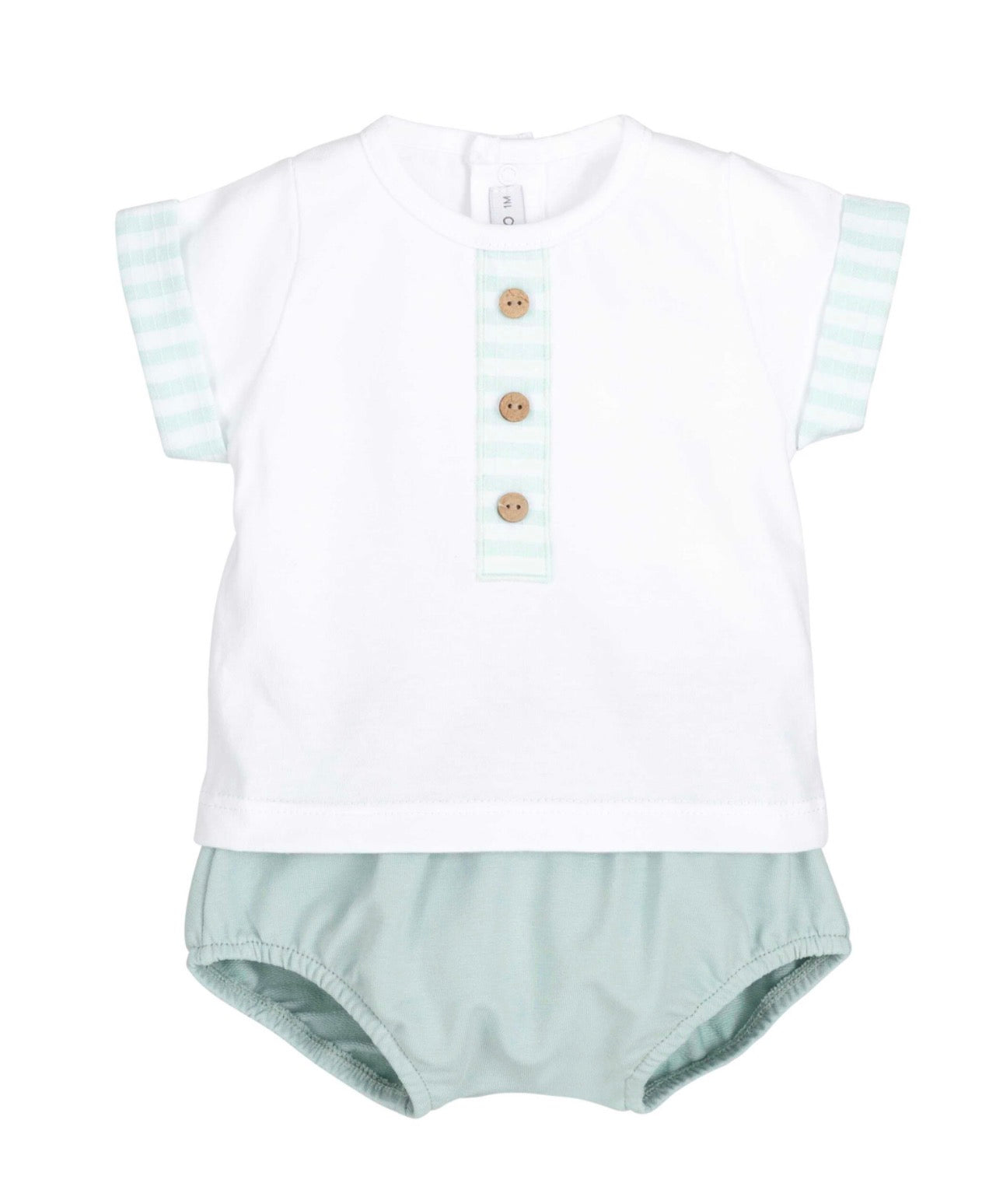 Conjunto de algodão verde e branco da Calamaro Baby para bebé menino e recém-nascido composto por camisola e tapa fraldas. Camisola de manga curta com gola redonda e detalhes nas mangas as riscas. Tapa fralda em algodão verde