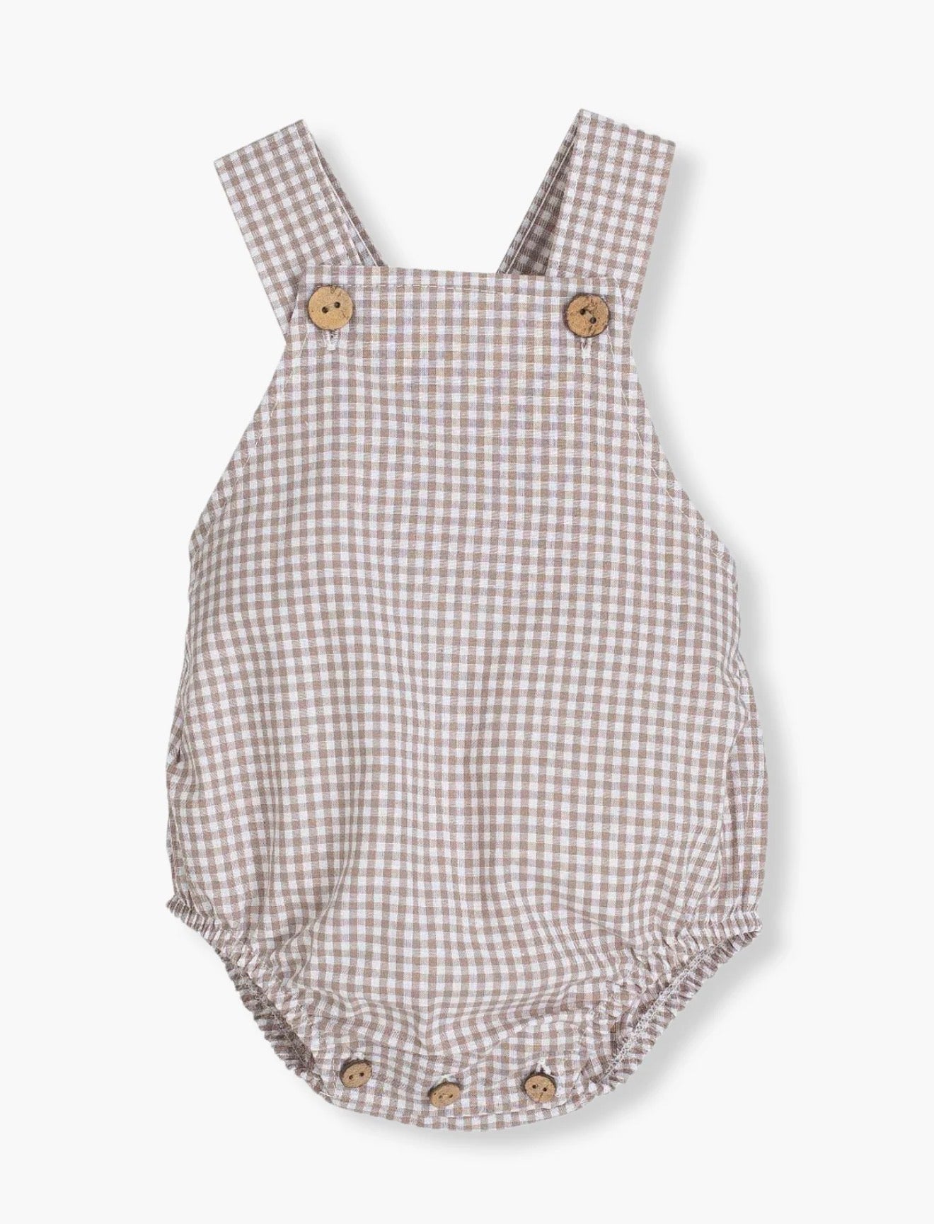 Fofo em algodão bege e branco com padrão vichy da Calamaro Baby para bebé e recém-nascido(a). Abertura nas alças e entrepernas com botões de madeira